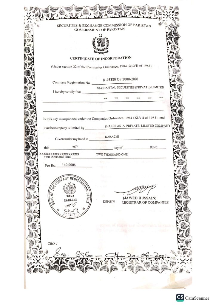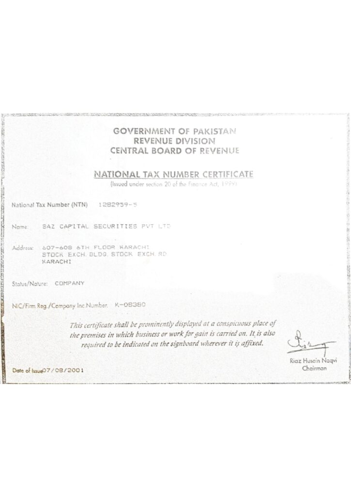 We started our business in (**1985**) with the name of “Sultan Ahmed Zakaria”. In June 2001, the company was incorporated as a Private Limited Company under the companies’ ordinance, 1984 with the name of SAZ Capital Securities (Pvt) Limited. Over the years our business has expanded manifold and now we are one of the prominent brokers in the market. This expansion in the business has been possible by the Grace of Almighty Allah, due to commitment to excellence and hard work of our professional team.