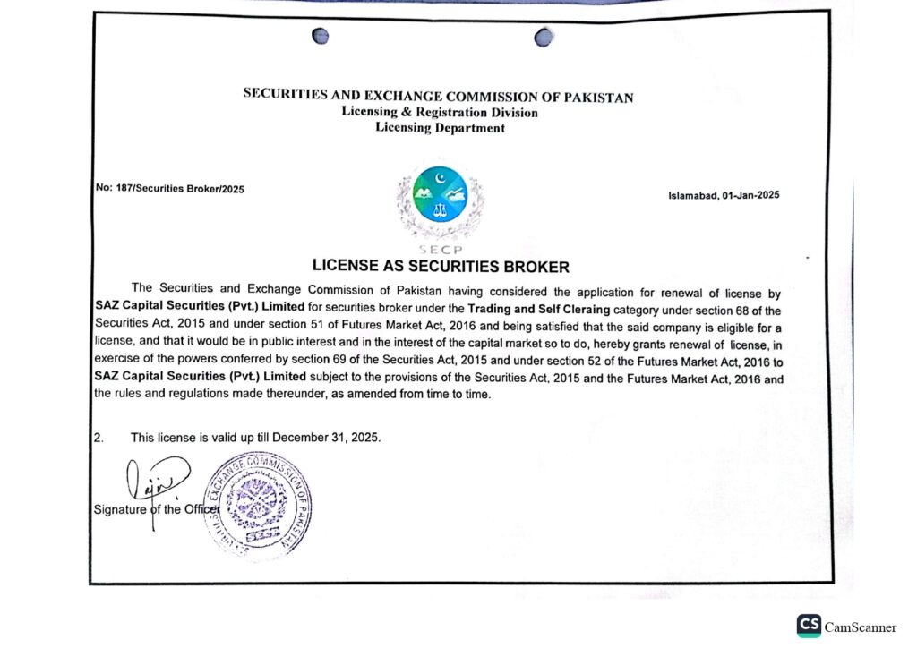 SAZ Capital Securities (Pvt) Limited is a brokerage house of Pakistan Stock Exchange Limited principally engaged in the business of investment advisory, financial consultancy, brokerage, underwriting, portfolio management and securities research.